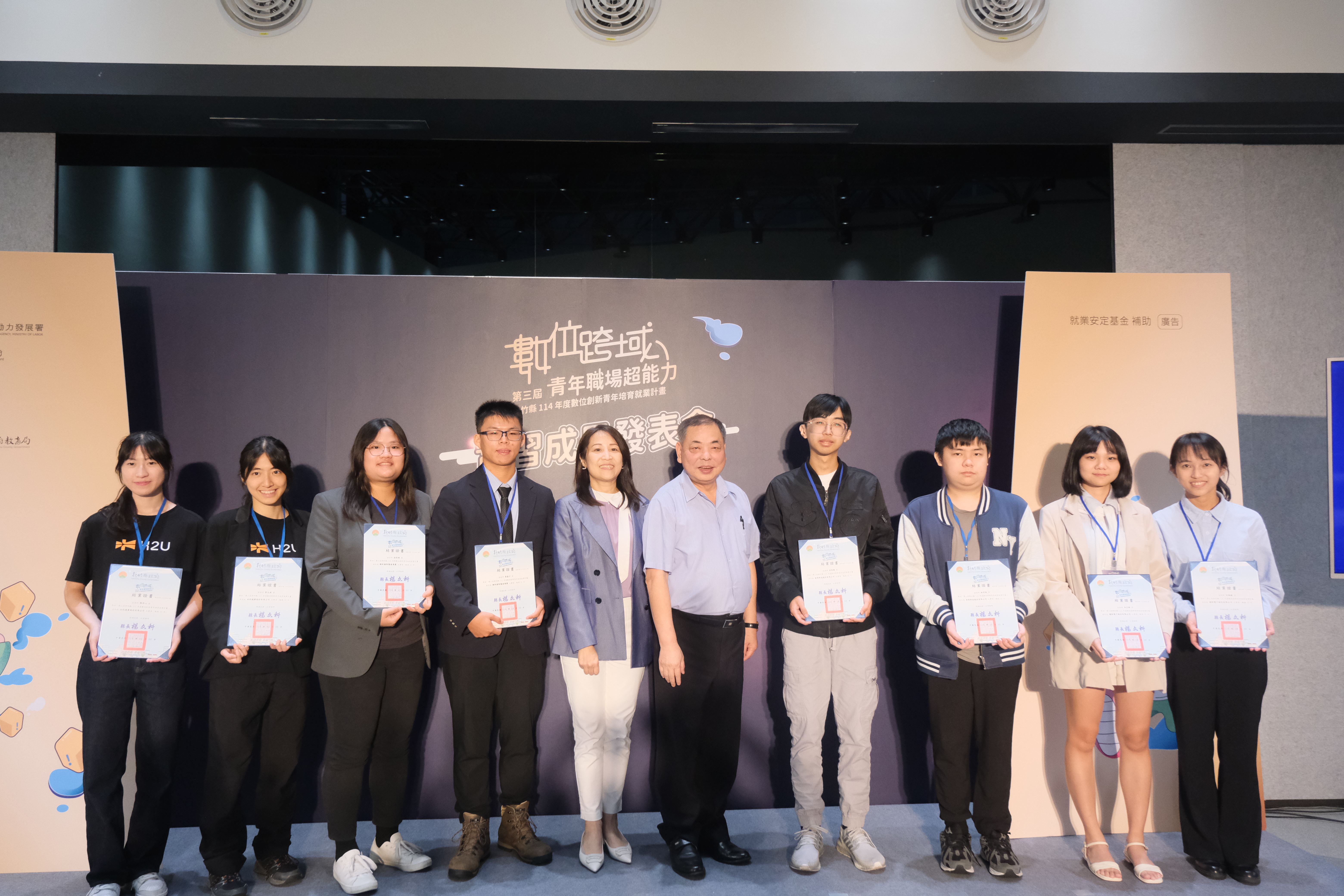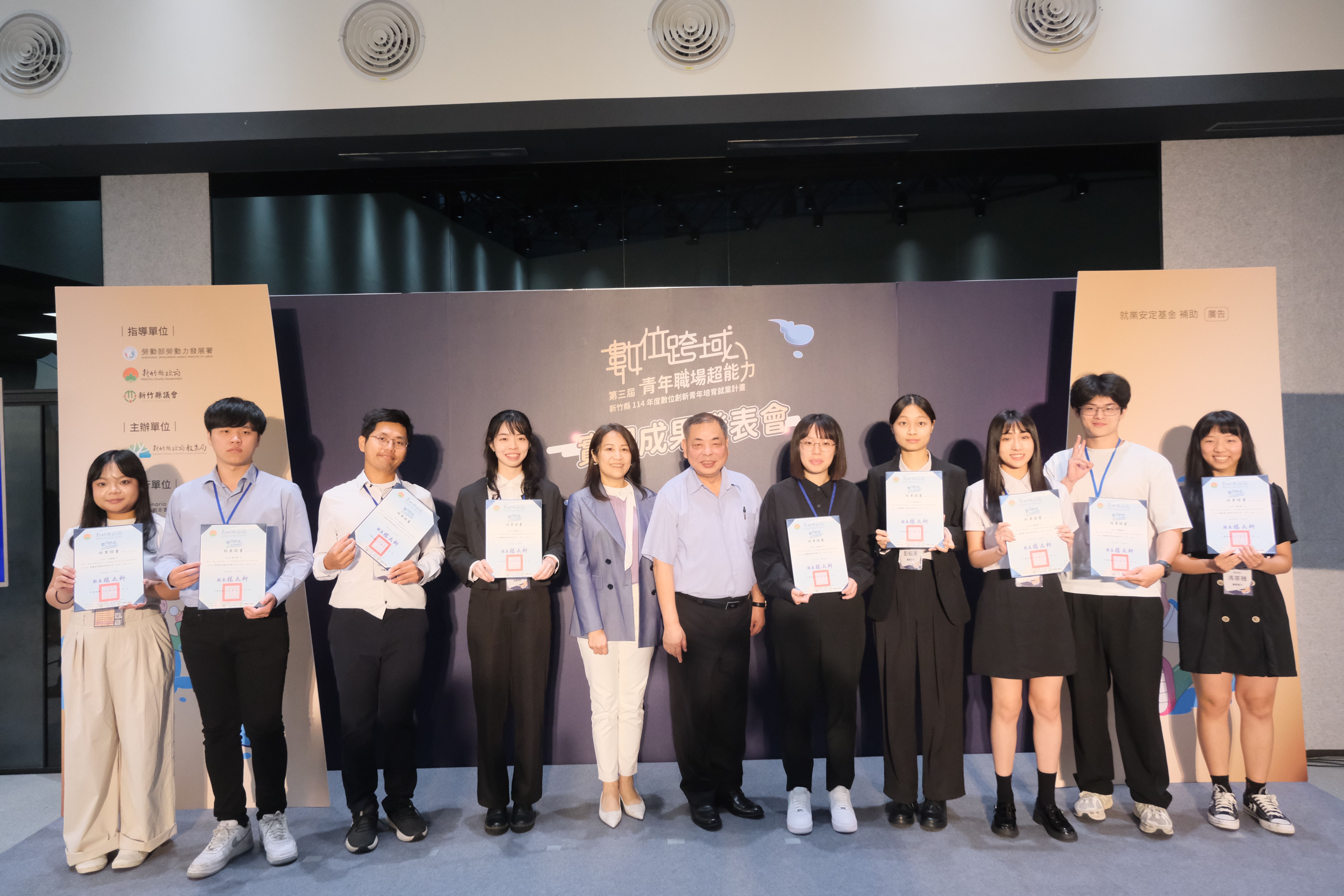 新竹縣政府自112年起邀集大專院校和企業共同打造青年就業實習平台,今年蒐羅更多元的實習職缺與優秀數位創新青年人才,打造雙贏成果,今(22日)特別舉辦「114年新竹縣數位創新青年培育就業計畫」第三屆實習成果發表會,新竹縣副縣長陳見賢頒發結業證書給完成45天職場實戰的優秀青年,並由學界、企業評選出8位績優實習生,分別頒發6000元獎勵金。