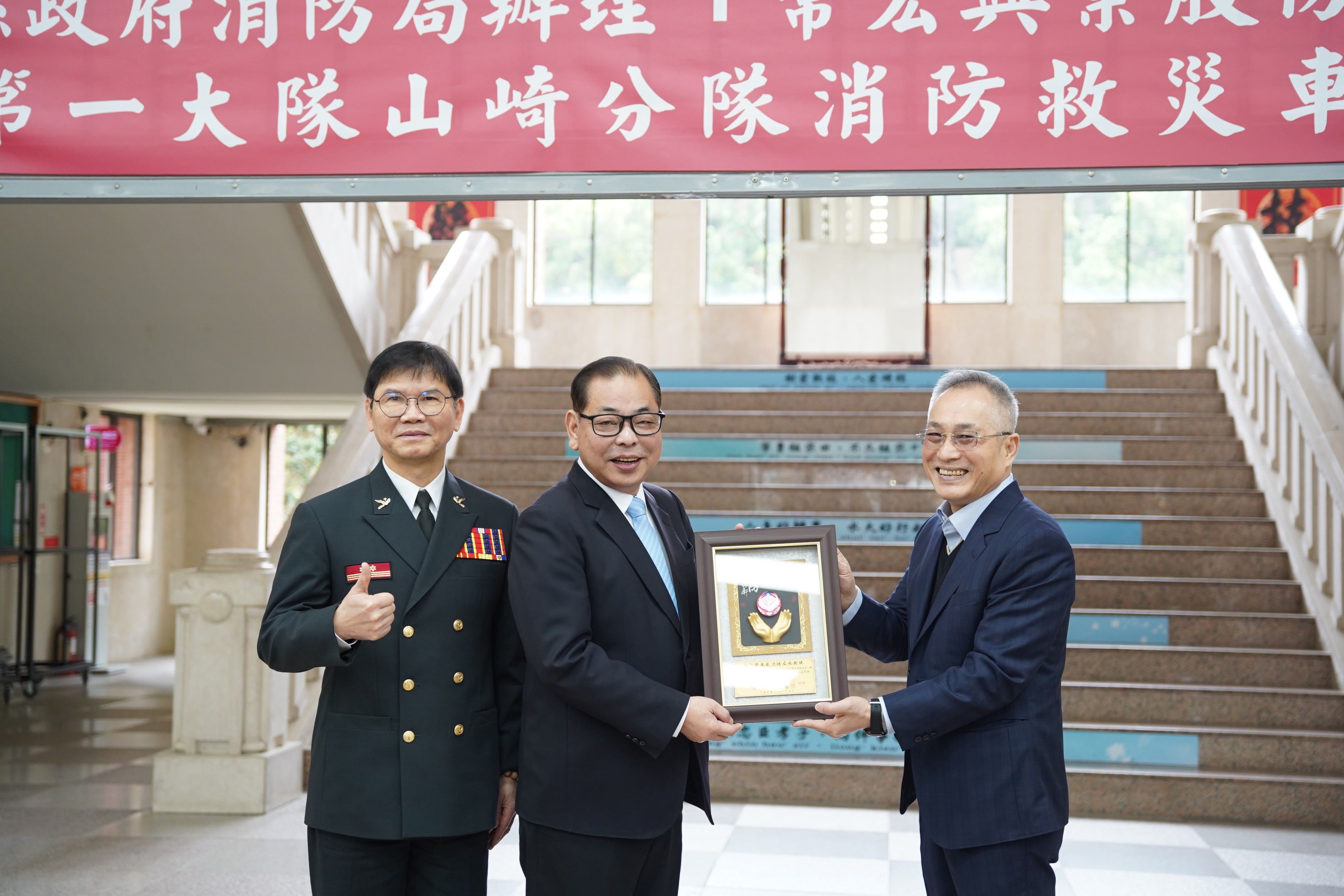 陳中振同步感謝「常宏興業股份有限公司」的愛心捐贈,並表示山崎分隊有這輛救災車的加入,對強化消防的救災能力助益良多,此車加入後將作為支援災害搶救、水域救援、載運人力物資、後勤補給及災情勘查等任務的重要交通工具。