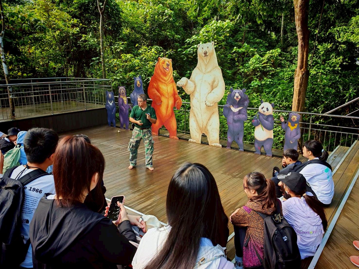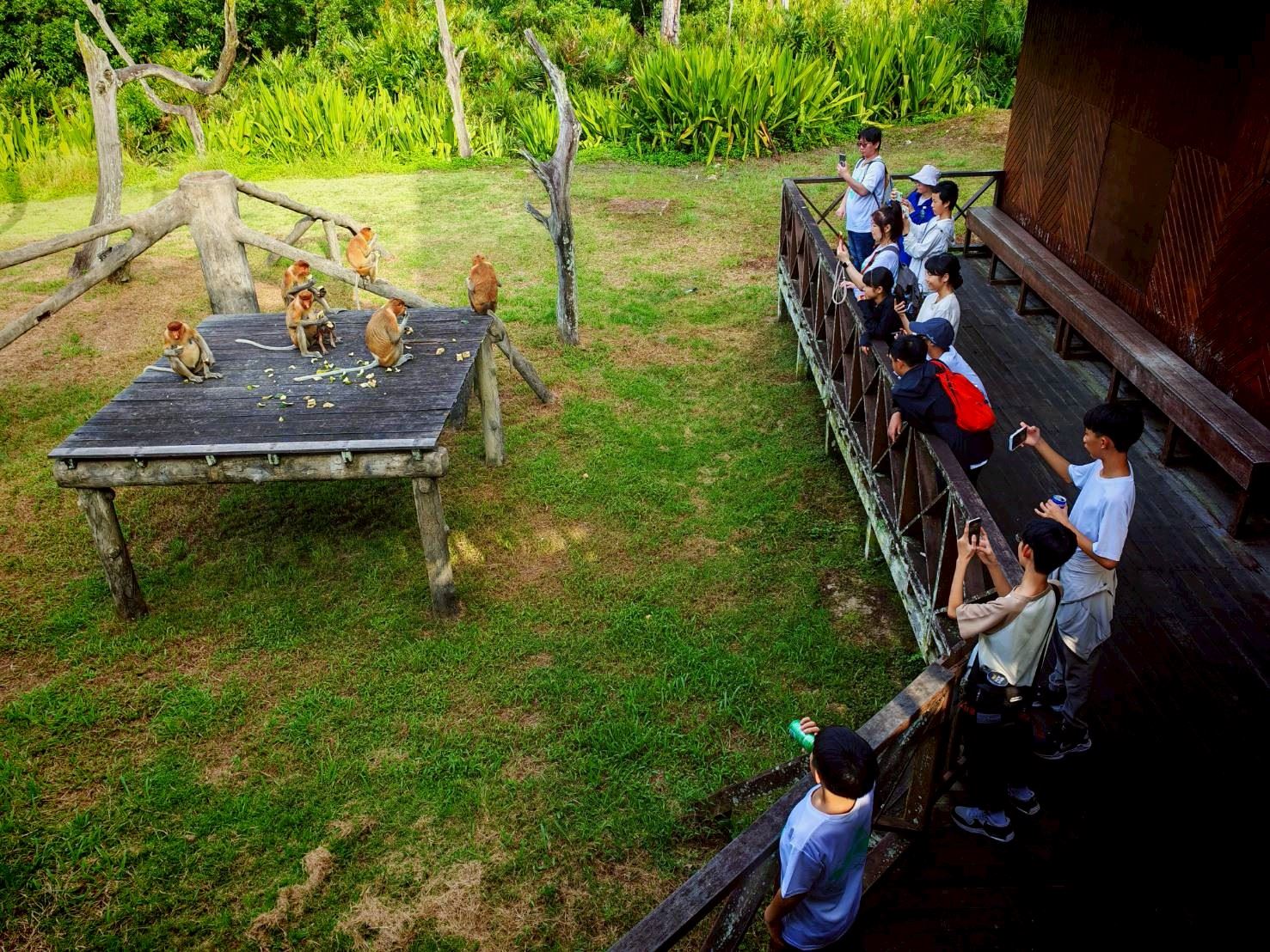 本次交流前半年即透過線上教室與海外夥伴建立穩定互動基礎,實體交流階段則前往沙巴山打根地區,進行校際交流與生態探訪。學生們除入班進行文化簡報、語言互動與團隊活動外,亦實地走訪馬來熊、紅毛猩猩及長鼻猴保育中心,並參與夜間雨林觀察與生態課程,在真實情境中深化對環境保育與全球議題的理解。